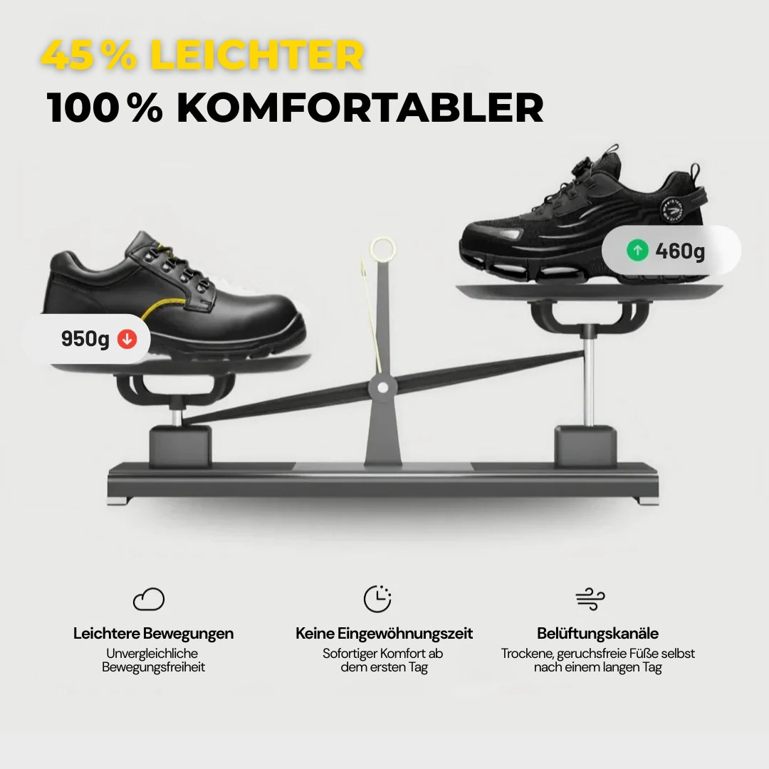 Unsere Sneaker sind 45 % leichter als herkömmliche Sicherheitsschuhe und bieten dennoch den gleichen S3-Schutz.